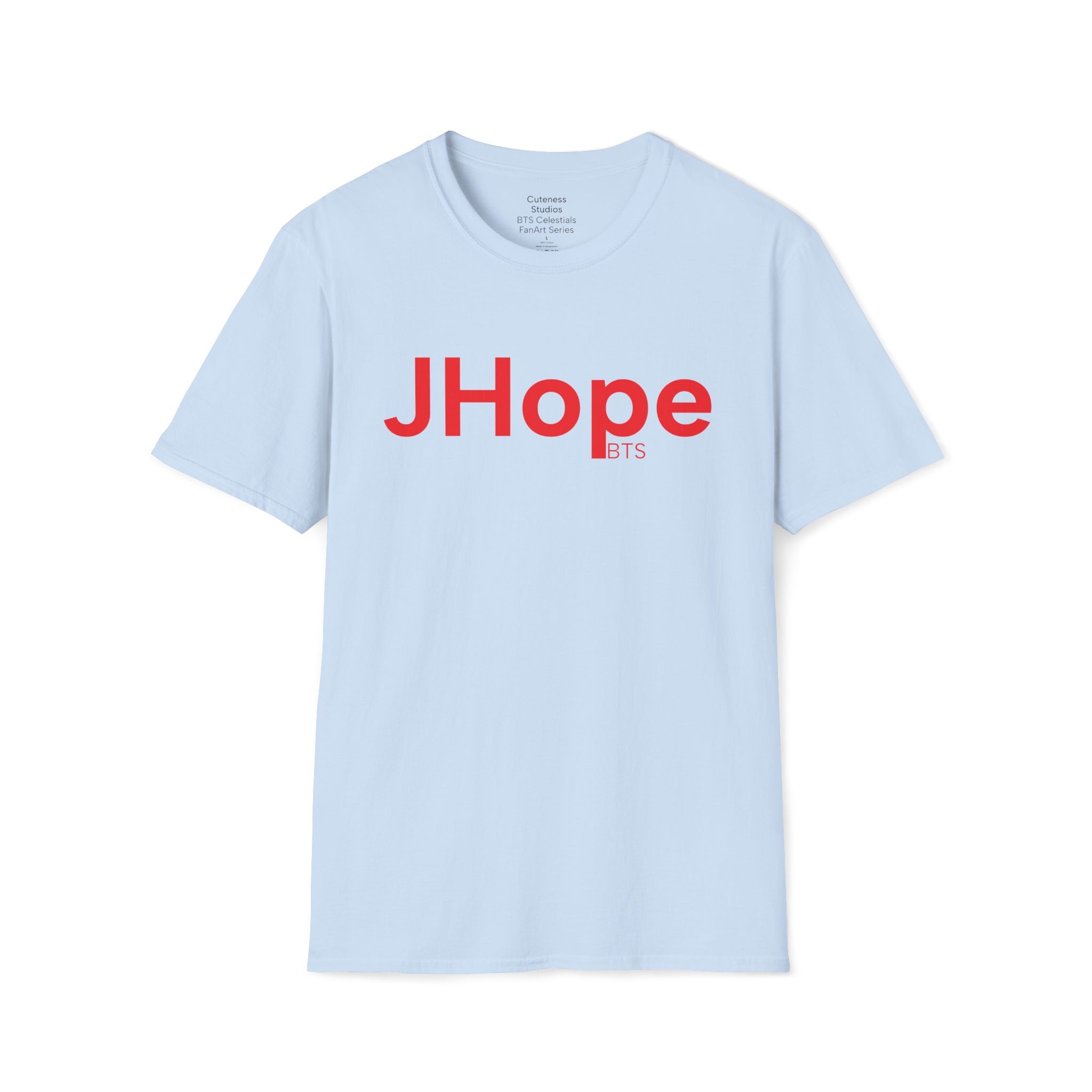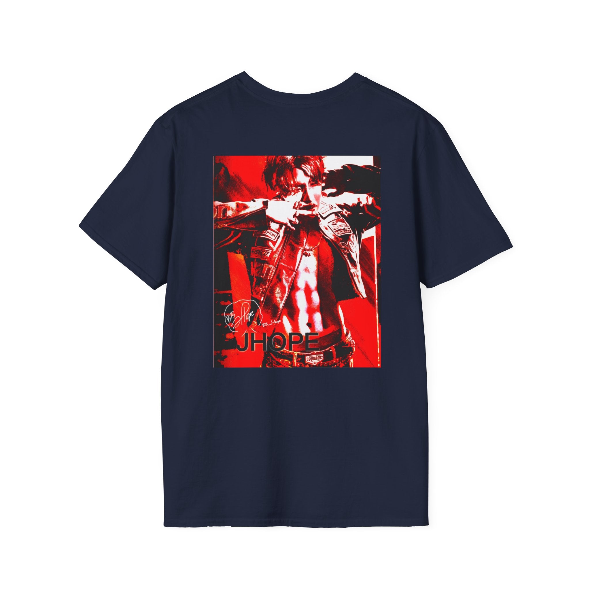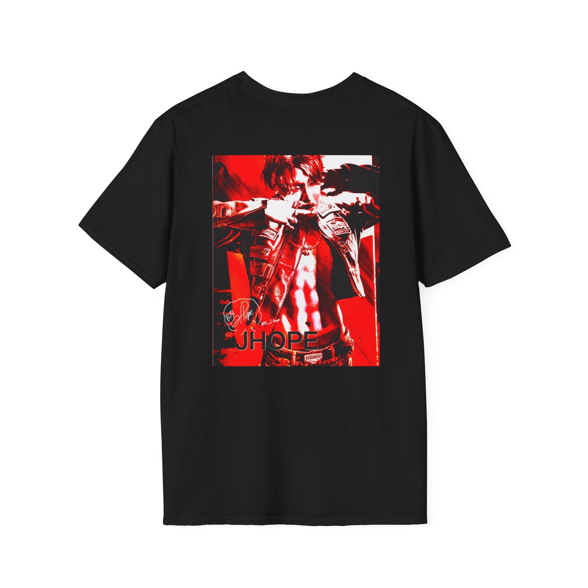 JHope of BTS is featured on this t-shirt with red being the main focus in homage to JHope's Hope On The Stage Tour. The art, using Procreate and Adobe Creative Suite software, was inspired by his photo shoot released during his tour.